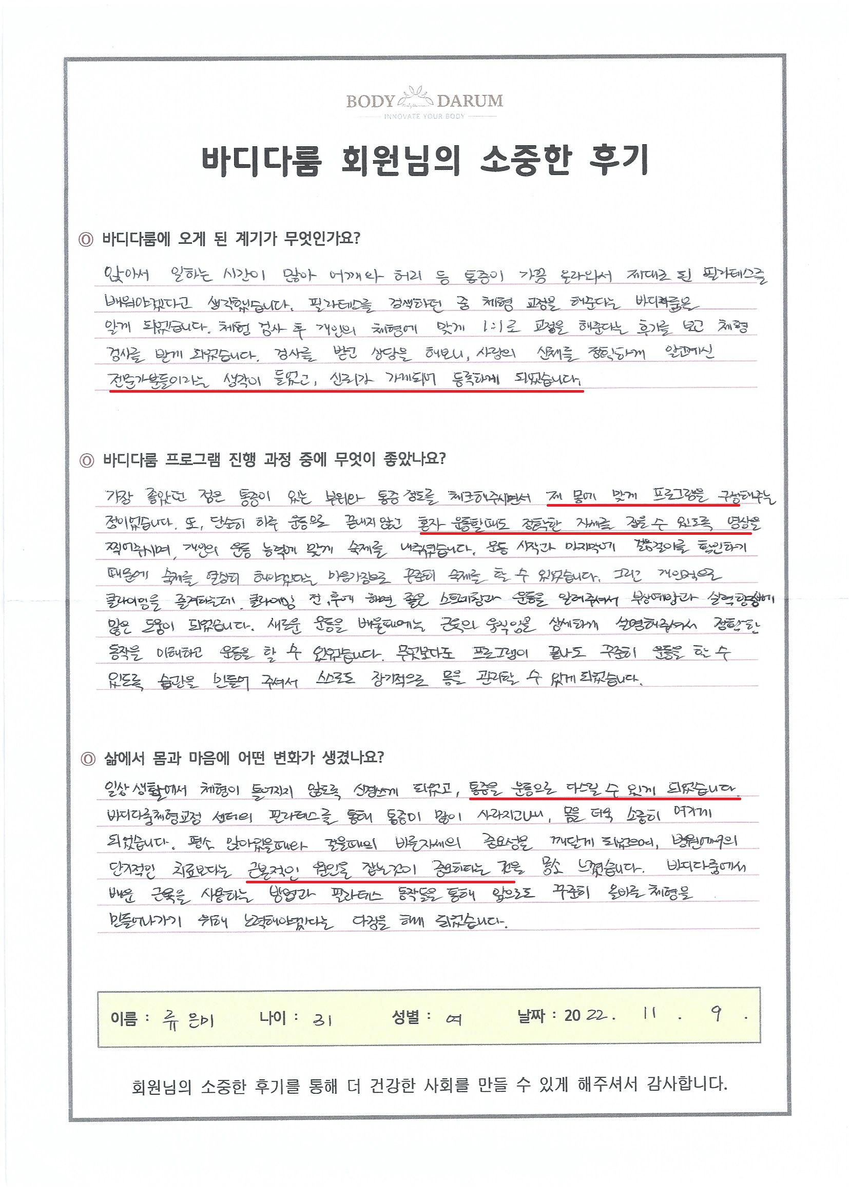 일상 생활에서 체형이 틀어지지 않도록 신경 쓰게 되었고, 통증을 운동으로 다스릴 수 있게 되었습니다. 바디다룸의 프로그램을 통해 통증이 많이 사라지고 나니, 몸을 더욱 소중히 여기게 되었습니다. 평소 앉아 있을 때와 걸을 때 바른 자세의 중요성을 깨닫게 되었으며, 병원에서의 단기적인 치료보다는 근본적인 원인을 잡는 것이 중요하다는 것을 몸소 느꼈습니다. 바디다룸에서 배운 근육을 사용하는 방법과 필라테스 동작들을 통해 앞으로도 꾸준히 올바른 체형을 만들어나가기 위해 노력해야겠다는 다짐을 하게 되었습니다.